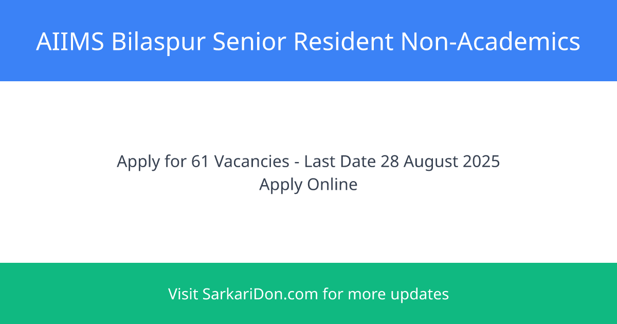 अखिल भारतीय आयुर्विज्ञान संस्थान, बिलासपुर हिमाचल प्रदेश में रिक्त सीनियर रेजिडेंट (गैर-शैक्षणिक) के 61 पद के लिए 28.08.2025 तक दोपहर 12 बजे तक ऑनलाइन आवेदन खुले हैं।
