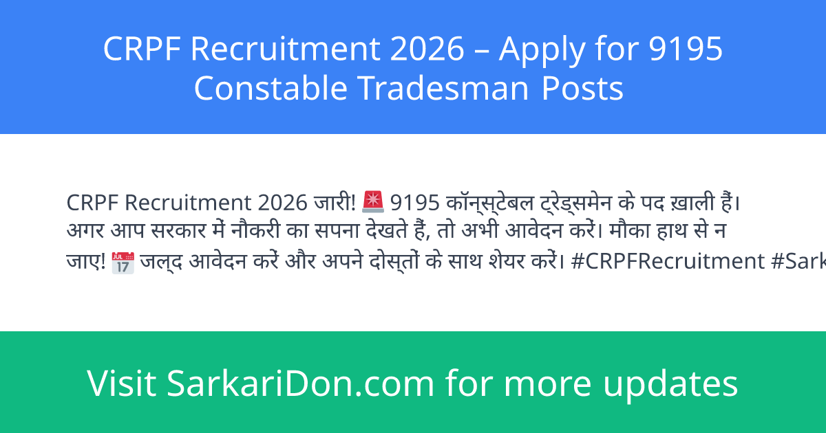 CRPF Recruitment 2026 β Apply for 9195 Constable Tradesman Posts