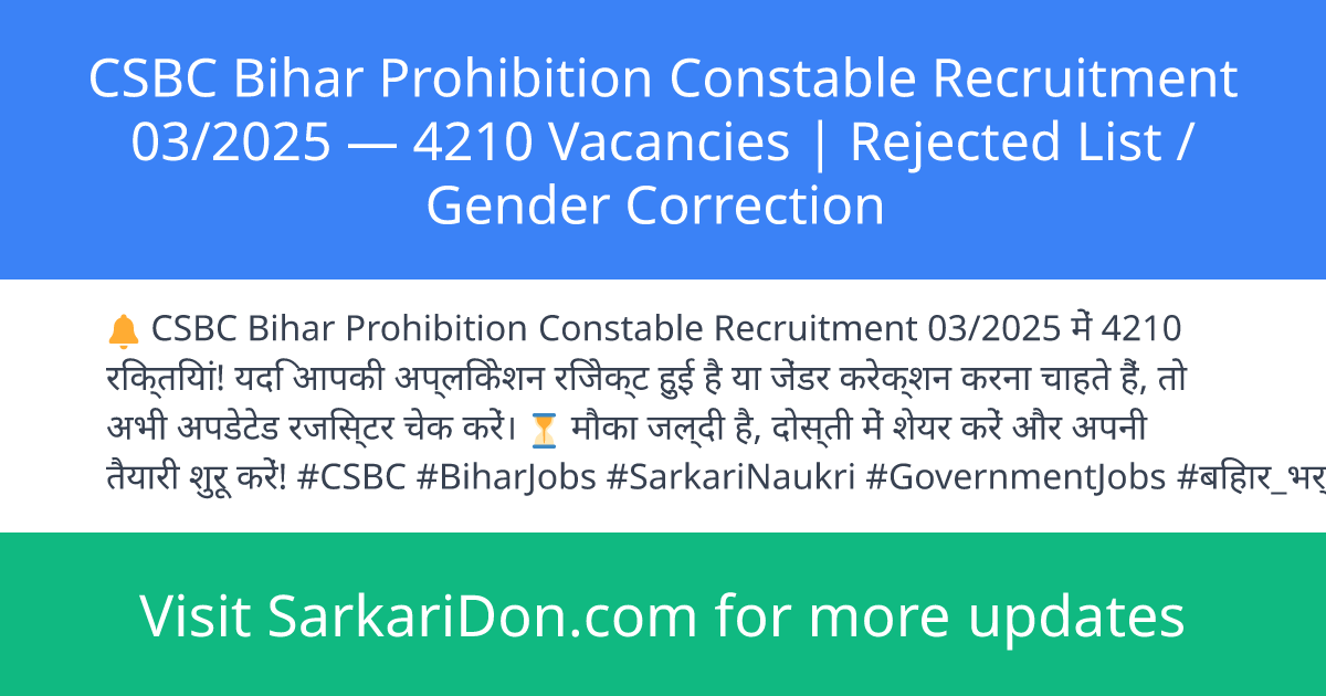 CSBC Bihar Prohibition Constable Recruitment 03/2025 — 4210 Vacancies | Rejected List / Gender Correction
