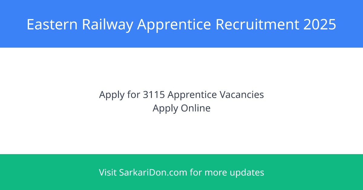 Eastern Railway has announced 3,115 Apprentice vacancies for its 2025 recruitment drive. This is an excellent opportunity for candidates looking for a sarkari naukri.