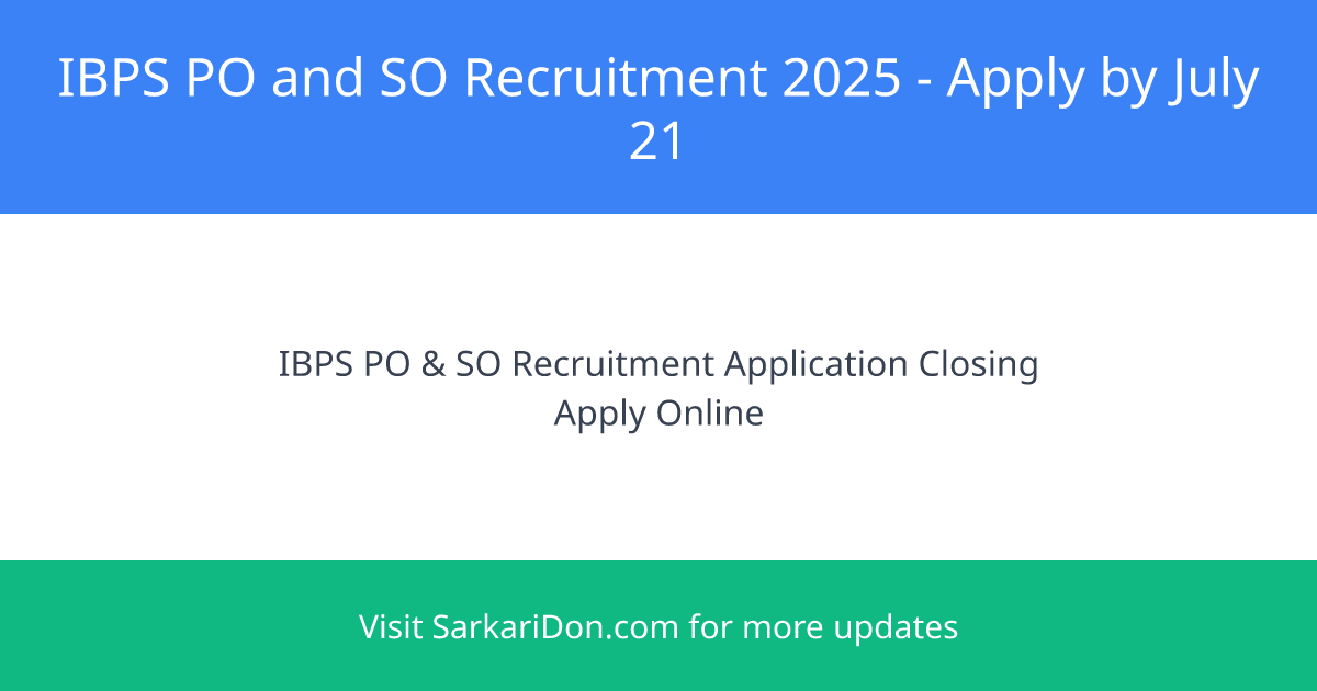 The Institute of Banking Personnel Selection (IBPS) will close the application window for IBPS PO and SO Recruitment 2025 today, July 21, 2025. A total of 6,215 vacancies are available, consisting of 5,208 Probationary Officer (PO) posts and 1,007 Specialist Officer (SO) posts. Eligible candidates must apply online through the official IBPS website (ibps.in) before the deadline ends today to avoid missing the opportunity.