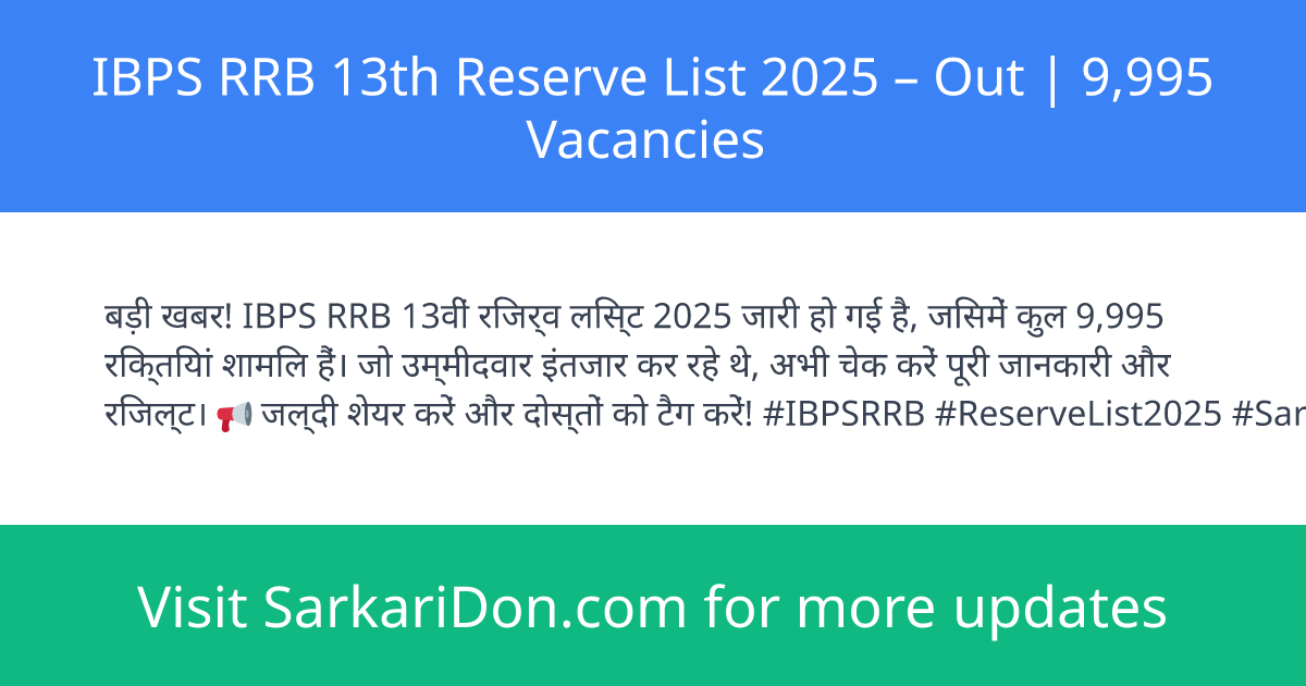 An official reserve list for the IBPS RRB 13th recruitment has been released by the Institute of Banking Personnel Selection (IBPS). The reserve list pertains to a total of Vacancy Count: 9,995 posts across Office Assistant and various Officer Scale posts. This page summarises the declared reserve list and provides verified official links and key details.