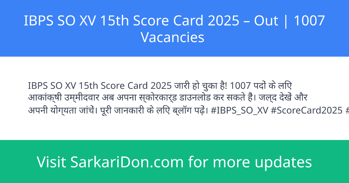 The Institute of Banking Personnel Selection (IBPS) conducts the CRP SPL-XV Specialist Officer (SO XV) recruitment for various specialist posts. This post informs candidates about the IBPS SO XV 15th Score Card 2025 and provides official links and key details. Candidates should check the official IBPS website for the score card and further updates. This sarkari result is relevant for candidates seeking a government job in specialist officer roles.