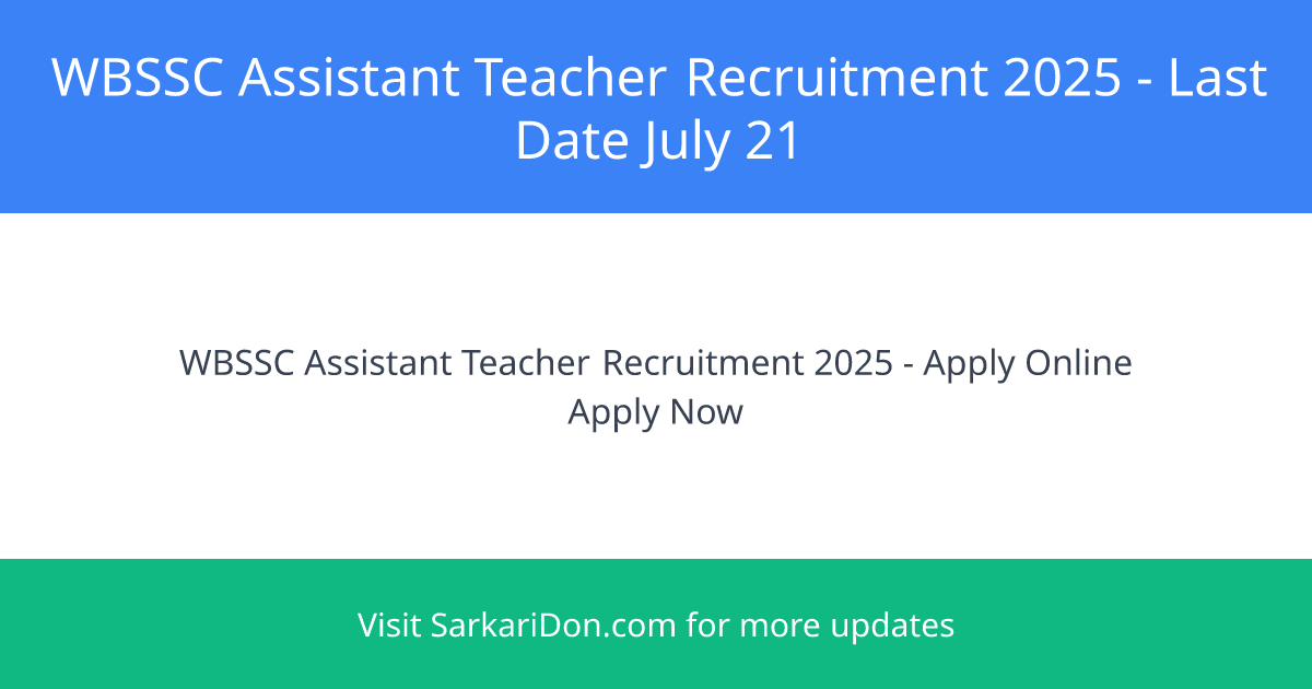 - Q: What is the last date to apply for WBSSC Assistant Teacher Recruitment 2025? A: The last date to apply is July 21, 2025, at 5:59 PM.