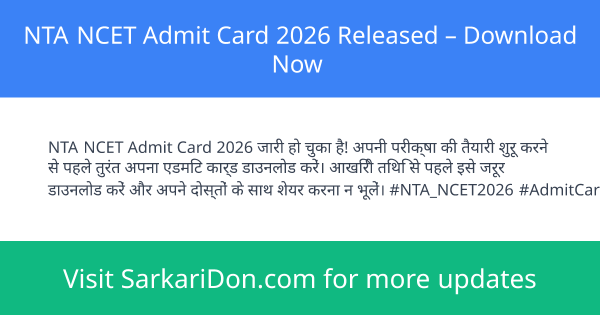 - Look for the βNTA NCET Admit Card 2026β link once it appears.