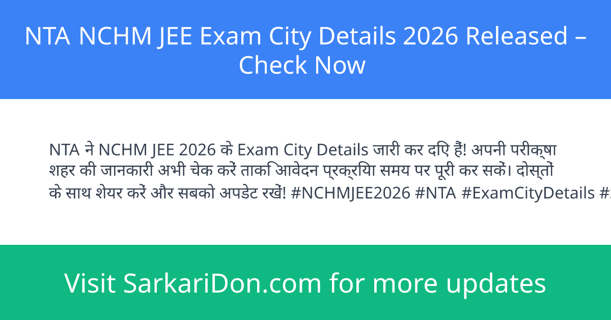 The National Testing Agency (NTA) has released the exam city details for the NTA NCHM JEE 2026. Candidates who have applied for the entrance exam can now check their allocated exam cities. This information will help candidates plan their travel and examination day arrangements effectively.