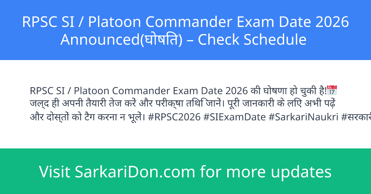The Rajasthan Public Service Commission (RPSC) has announced the exam dates for the RPSC SI / Platoon Commander recruitment 2025. Candidates who have applied for these positions can prepare for the written examination scheduled to be held on April 5 and April 6, 2026. Stay tuned for more updates and make sure to download your admit card once released.