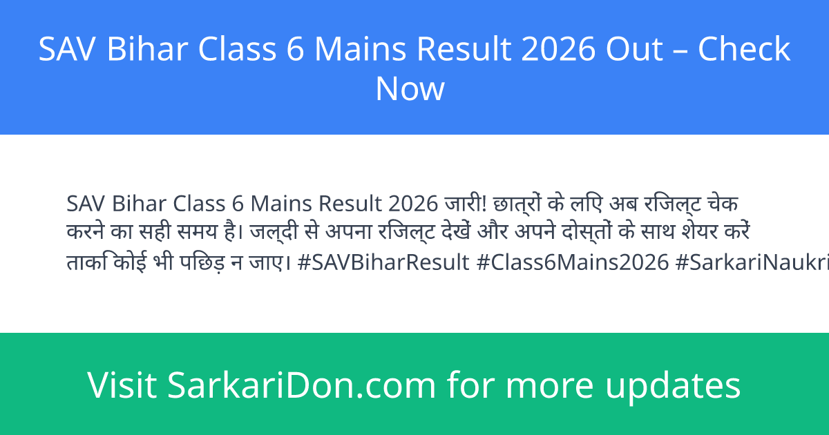 SAV Bihar Class 6 Mains Result 2026 Out โ Check Now