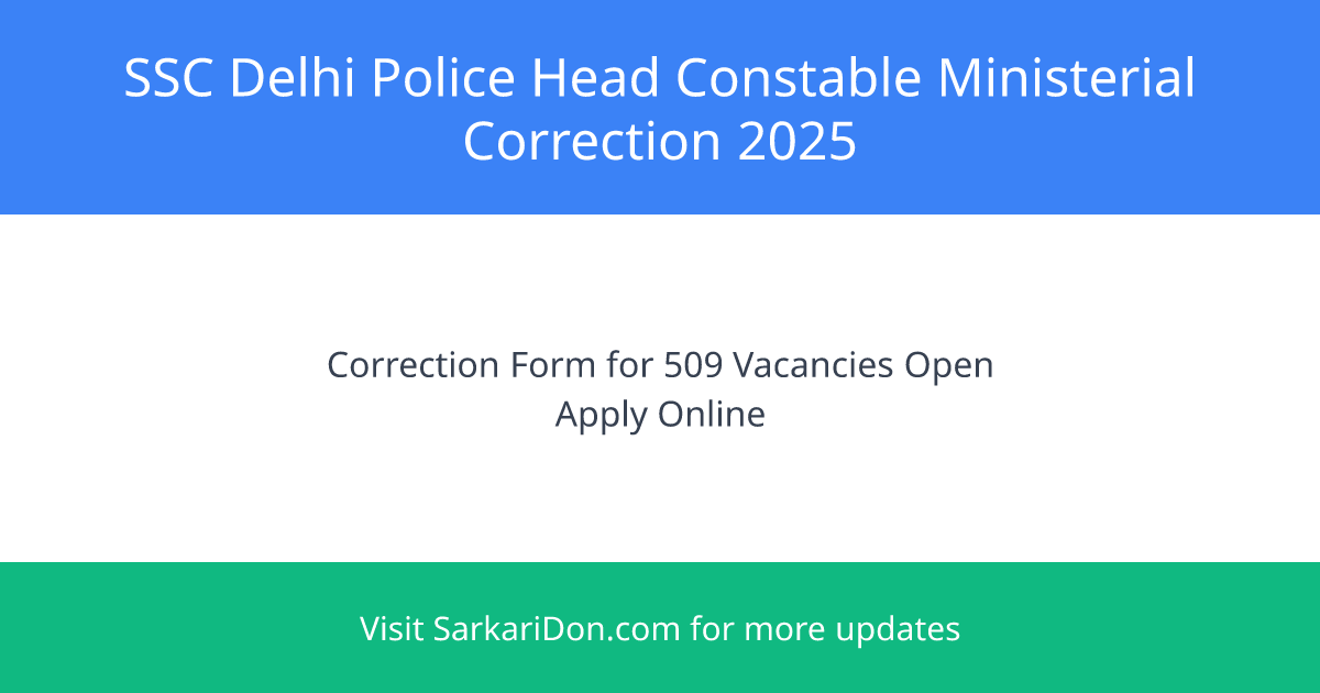 The Staff Selection Commission (SSC Delhi Police) has released the Correction Form for the recruitment of Delhi Police Head Constable (Ministerial) Post. This recruitment includes 509 positions. Candidates who have already applied can now make corrections on the official SSC website.