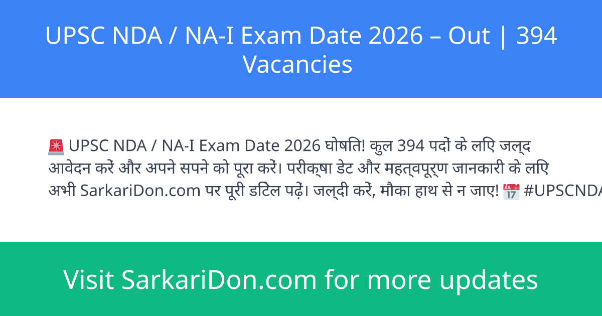 The Union Public Service Commission (UPSC) has released details for the UPSC NDA / NA-I Recruitment 2026. This national level entrance exam is for admission to the National Defence Academy and Naval Academy. Vacancy Count: 394