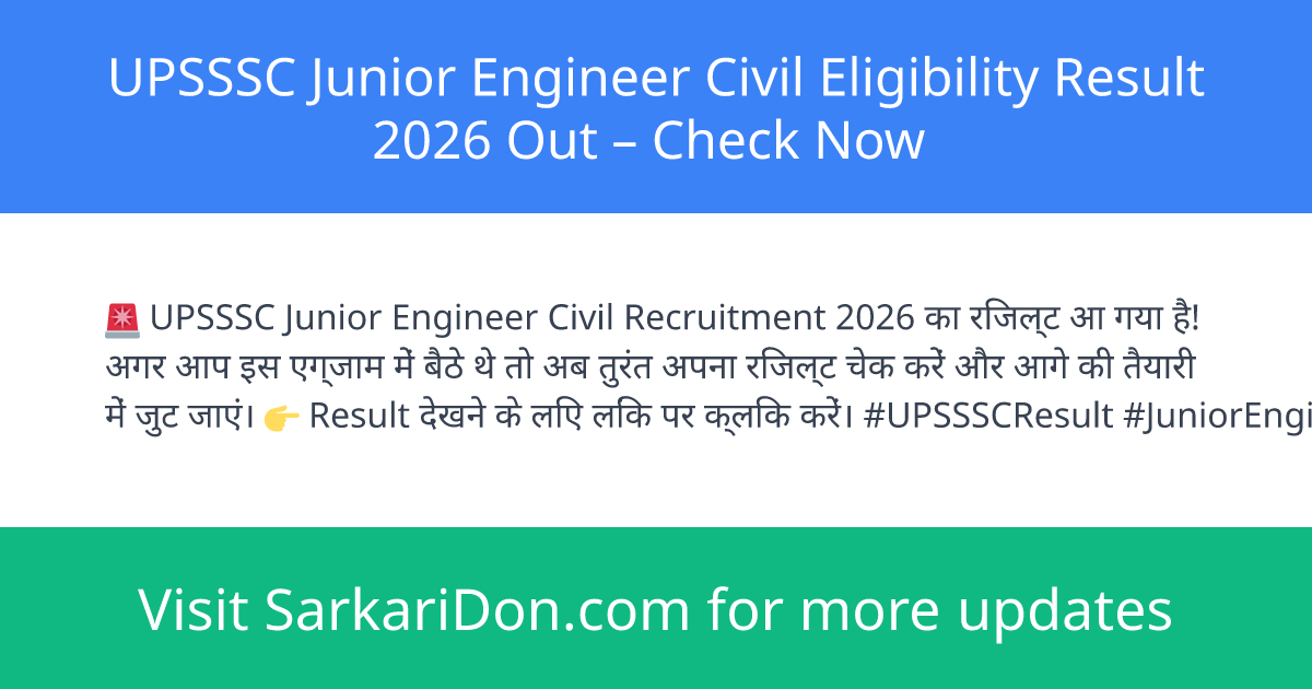 The Uttar Pradesh Subordinate Services Selection Commission (UPSSSC) has officially declared the eligibility result for the Junior Engineer Civil Recruitment 2026. Candidates who appeared for the recruitment process can now check their eligibility results online. It is important for candidates to verify their status promptly to proceed with the next stages of the recruitment.