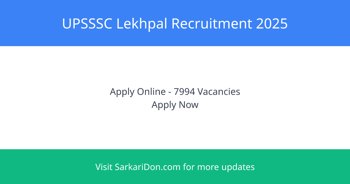 Uttar Pradesh Subordinate Service Selection Commission (UPSSSC) has announced UPSSSC Lekhpal Recruitment 2025 for a total of 7994 vacancies. This sarkari naukri offers opportunities for candidates who meet the prescribed eligibility. The recruitment is conducted by UPSSSC β the official body responsible for subordinate service selections in Uttar Pradesh.