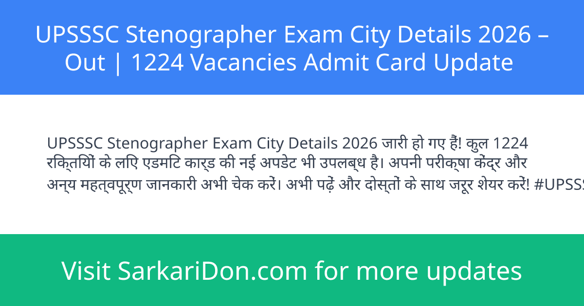 UPSSSC Stenographer Exam City Details 2026 β Out | 1224 Vacancies Admit Card Update
